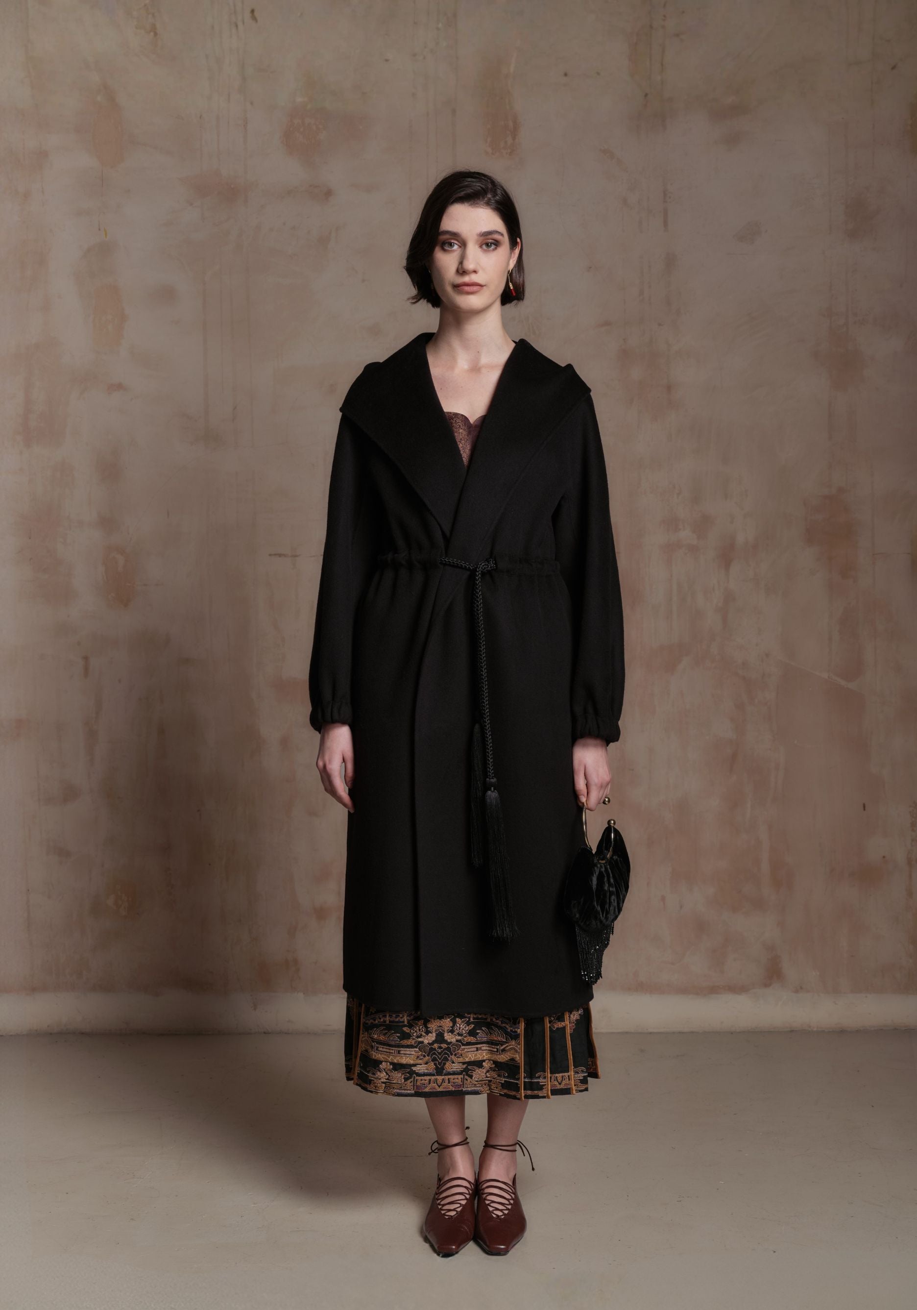 A luxurious wool-cashmere-silk blend coat featuring a hood, a fluid silhouette, and elegant tassel-tie detail. Designed for timeless warmth and refined elegance, it drapes beautifully to create a sophisticated statement for the colder season.