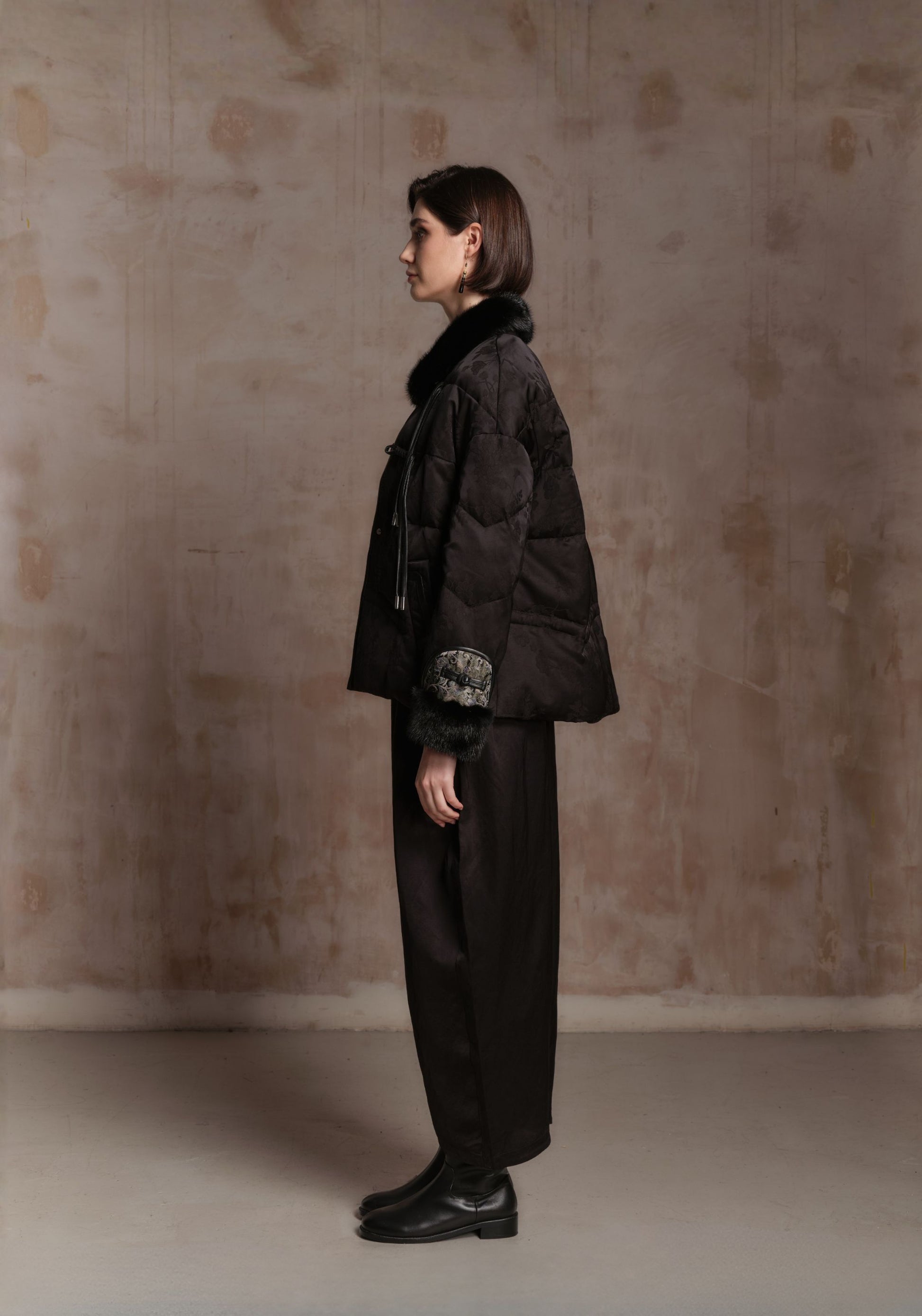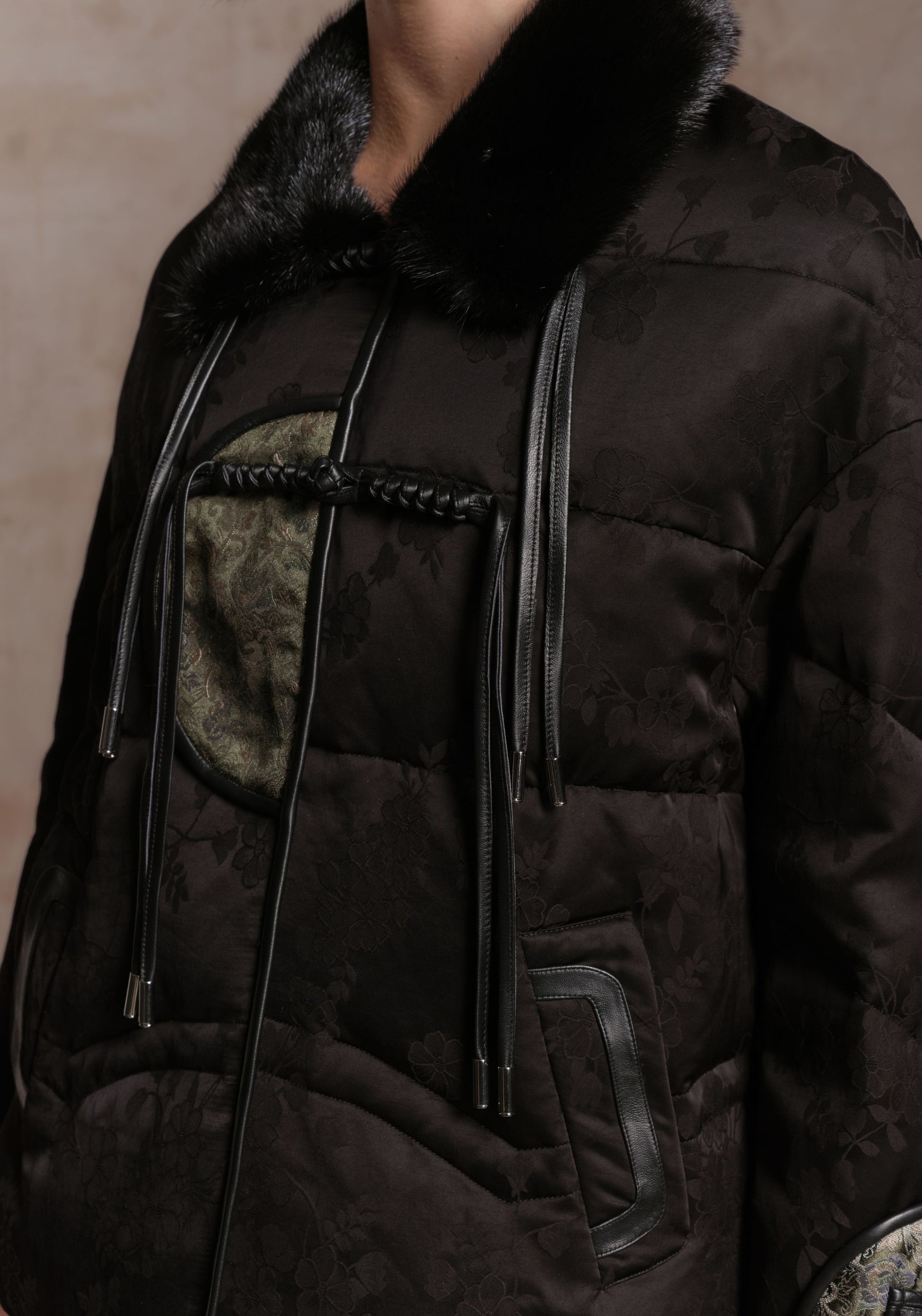 A refined puffer jacket accented with mink fur trims and filled with warm goose down. Finished with subtle floral jacquard details and Chinese inspired touches for an elegant, elevated winter look.