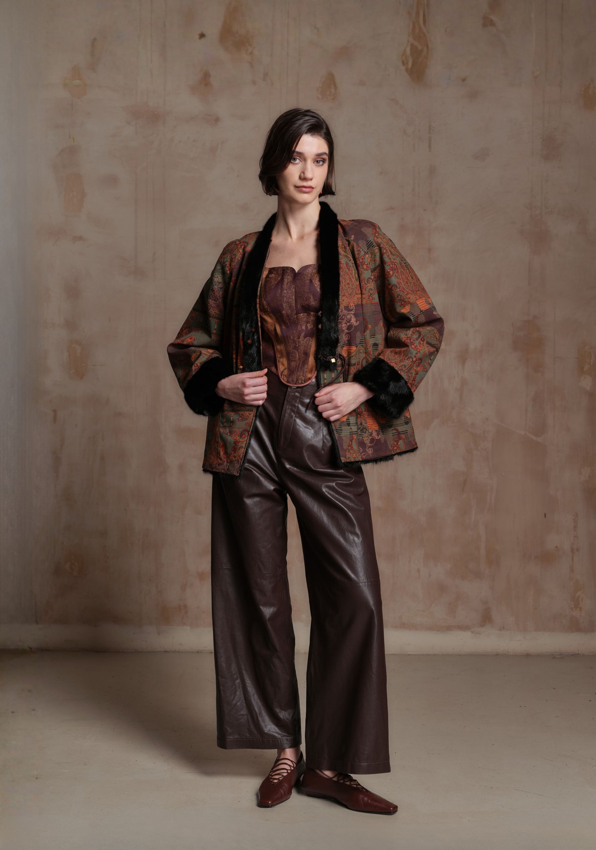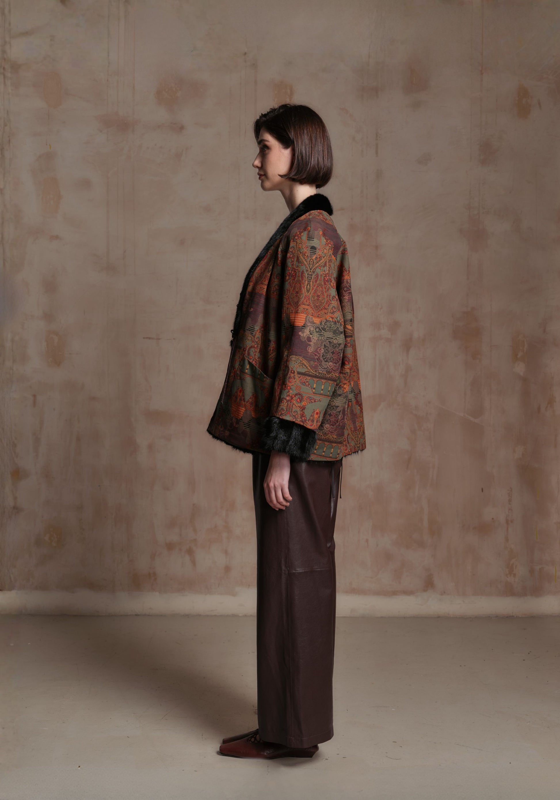 A reversible jacket crafted from 100% mulberry silk and mink fur. Featuring intricate patterns inspired by traditional artistry, it blends luxury and warmth in a statement design.