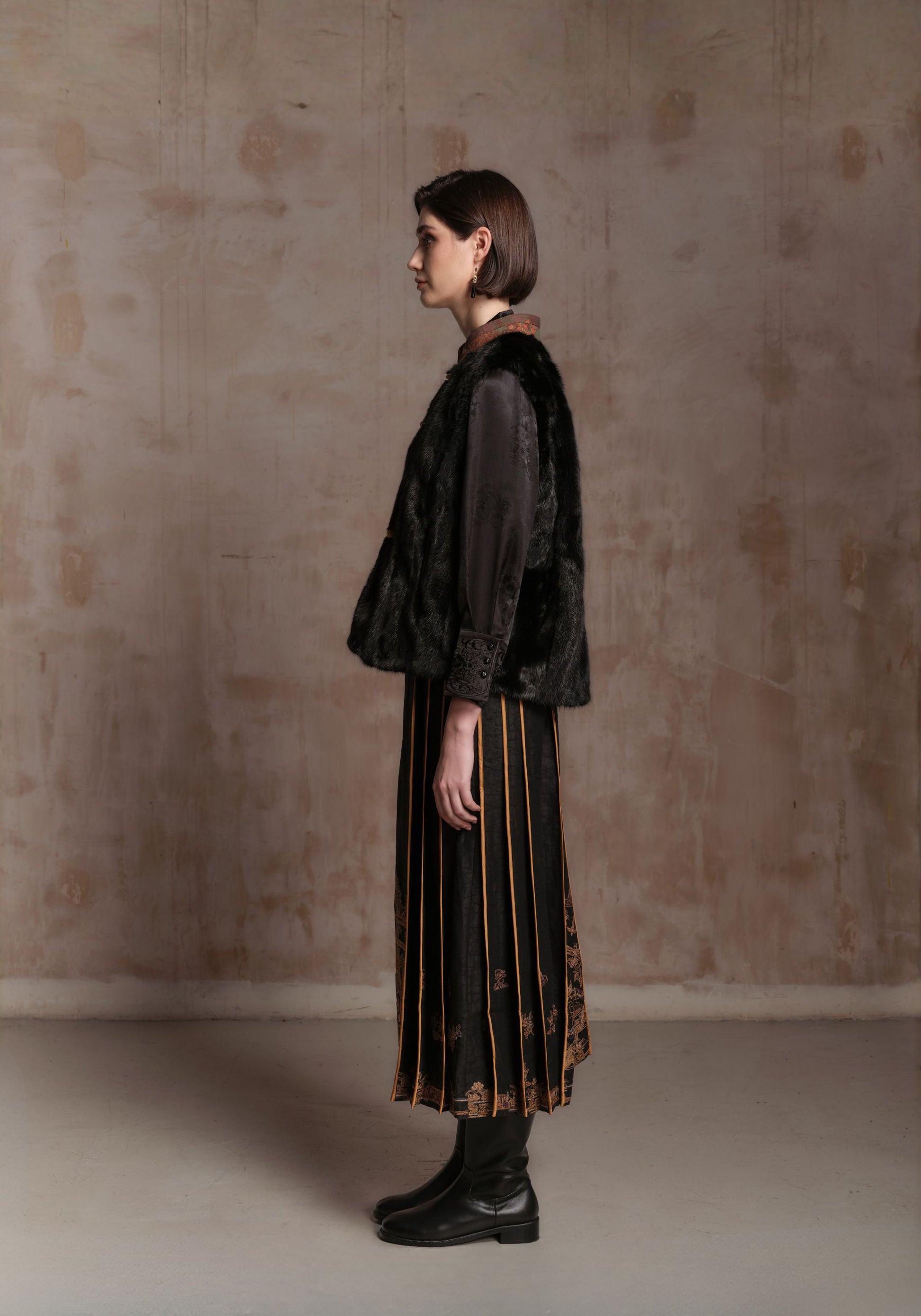 Reversible vest crafted from 100% mulberry silk and mink fur. Richly patterned and luxuriously soft — a statement layering piece. You can style with our Mud-Dyed Silk skirt and silk blouse.