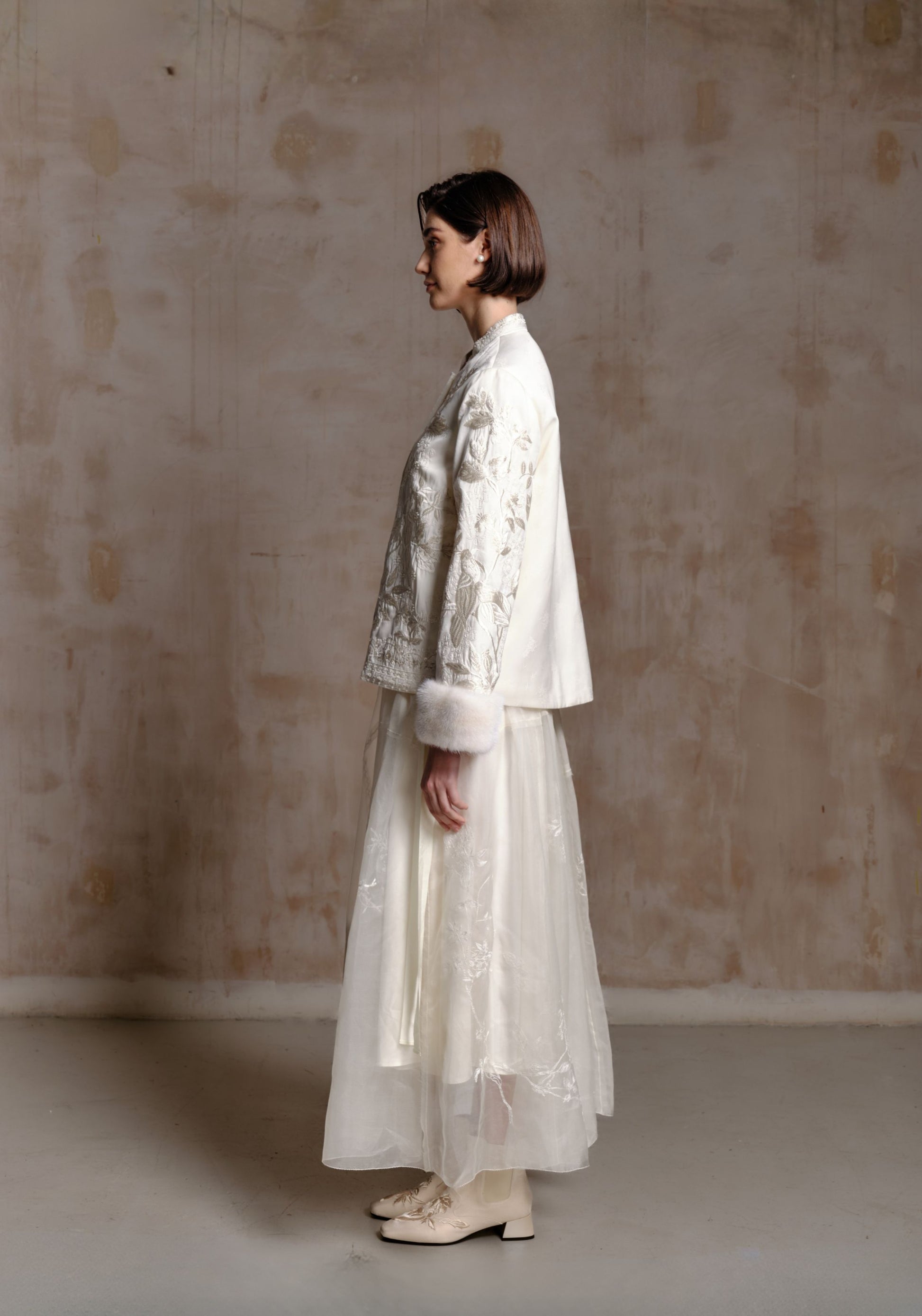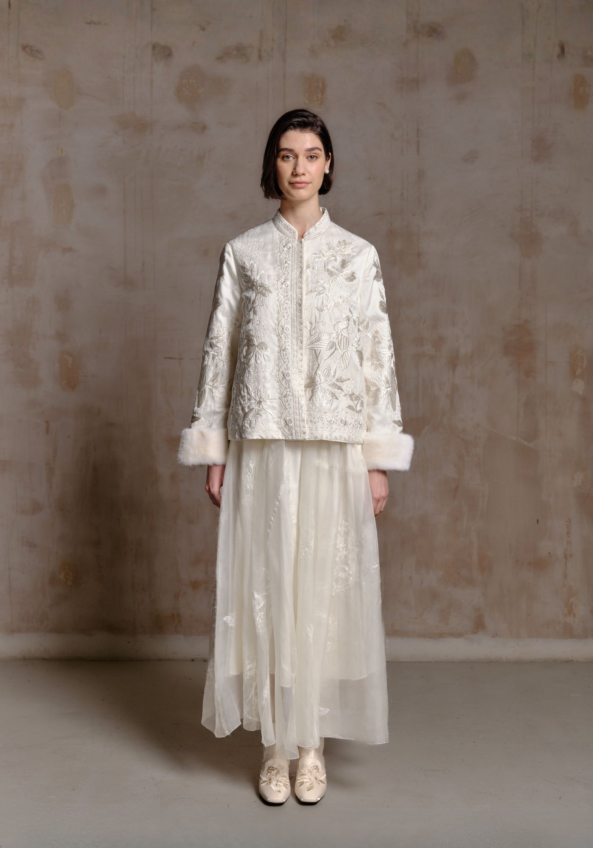 An elegant white jacket featuring intricate tonal embroidery throughout, blending traditional craftsmanship with a refined modern silhouette. Designed with soft mink fur cuffs for a luxurious finishing touch, it offers a graceful and sophisticated look.