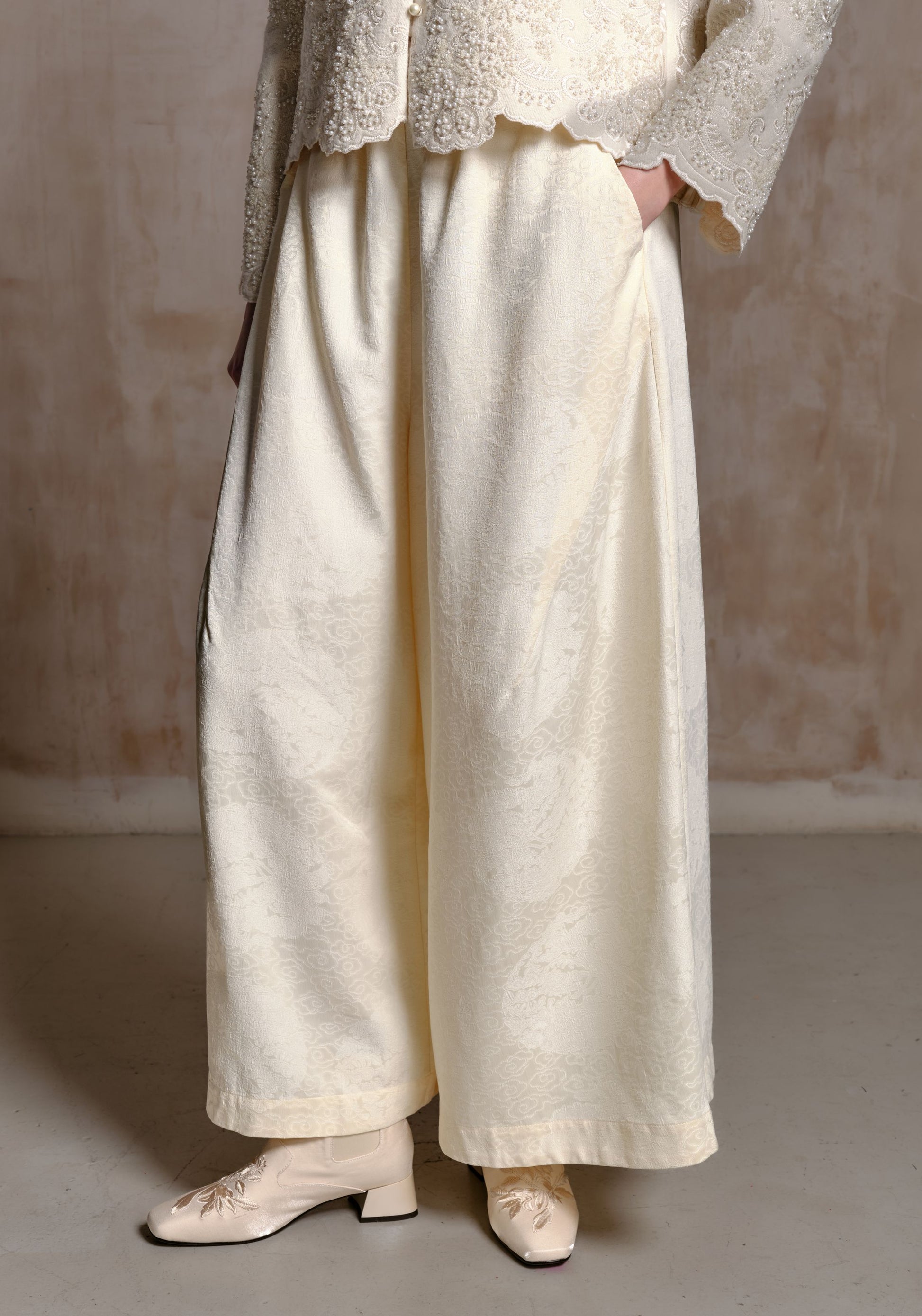 Crafted with a soft, fluid drape, these wide leg pants offer an effortlessly refined silhouette. The relaxed waistband and full length cut provide comfort while maintaining an elevated look. With their subtle sheen and delicate texture, they bring a minimalist yet striking elegance to both everyday outfits and special occasions.