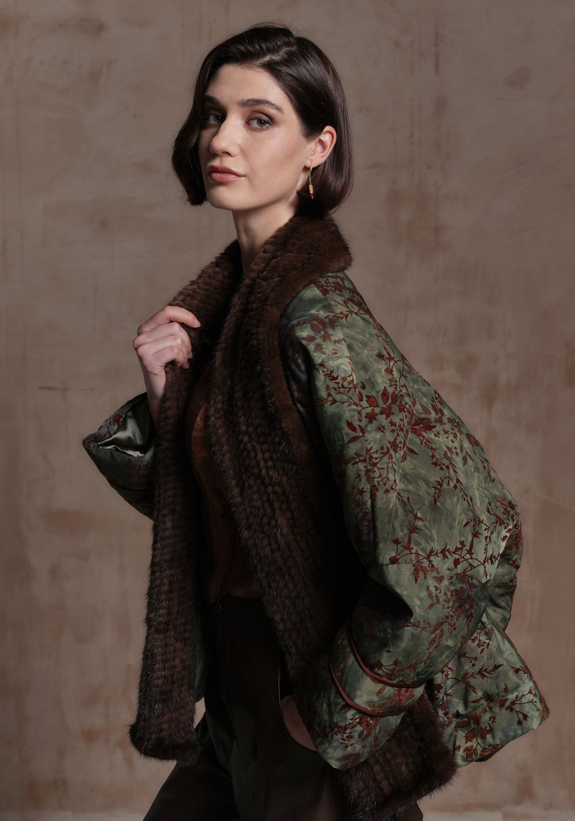 A floral patterned luxury puffer jacket accented with plush mink fur on the collar and trims. Featuring a removable zip on collar, adjustable drawcords, and refined embroidery, it delivers both warmth and elegance. Filled with goose down for superior insulation.