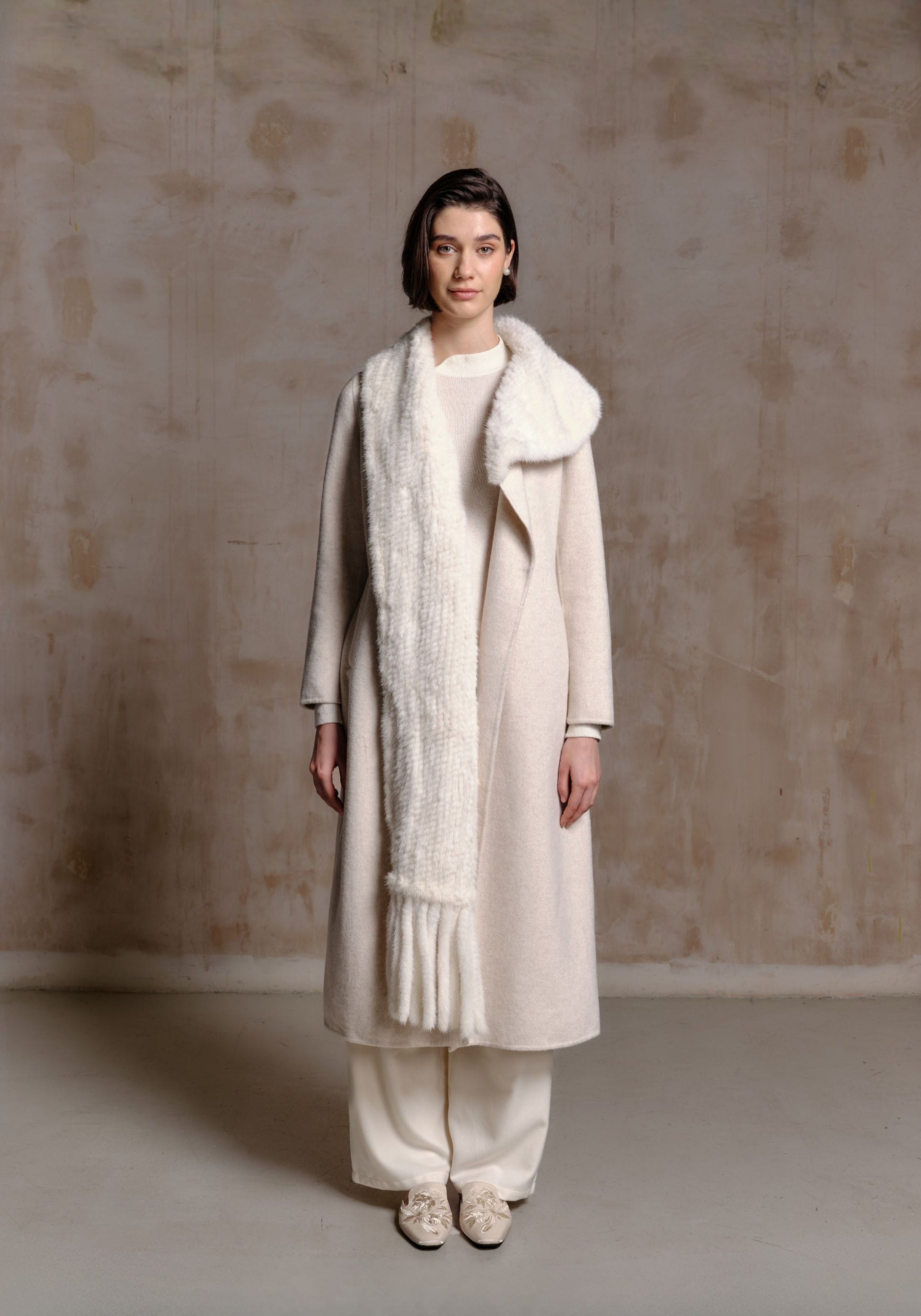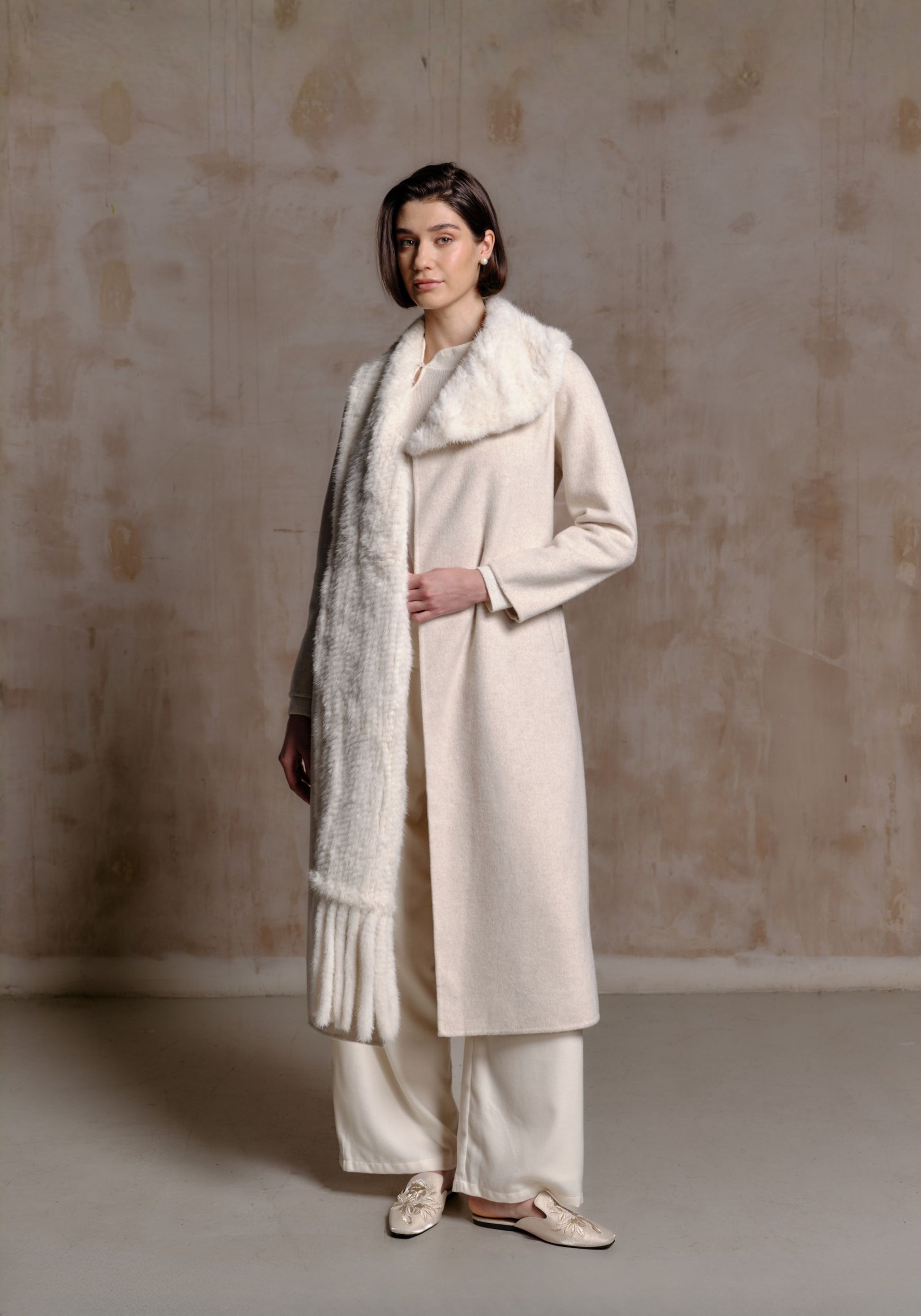 An elegant long oat white coat crafted from a luxurious wool cashmere blend, featuring an integrated mink fur scarf that drapes gracefully along the neckline. Designed with a clean, minimal silhouette and a soft textured finish, it combines timeless sophistication with refined winter warmth.