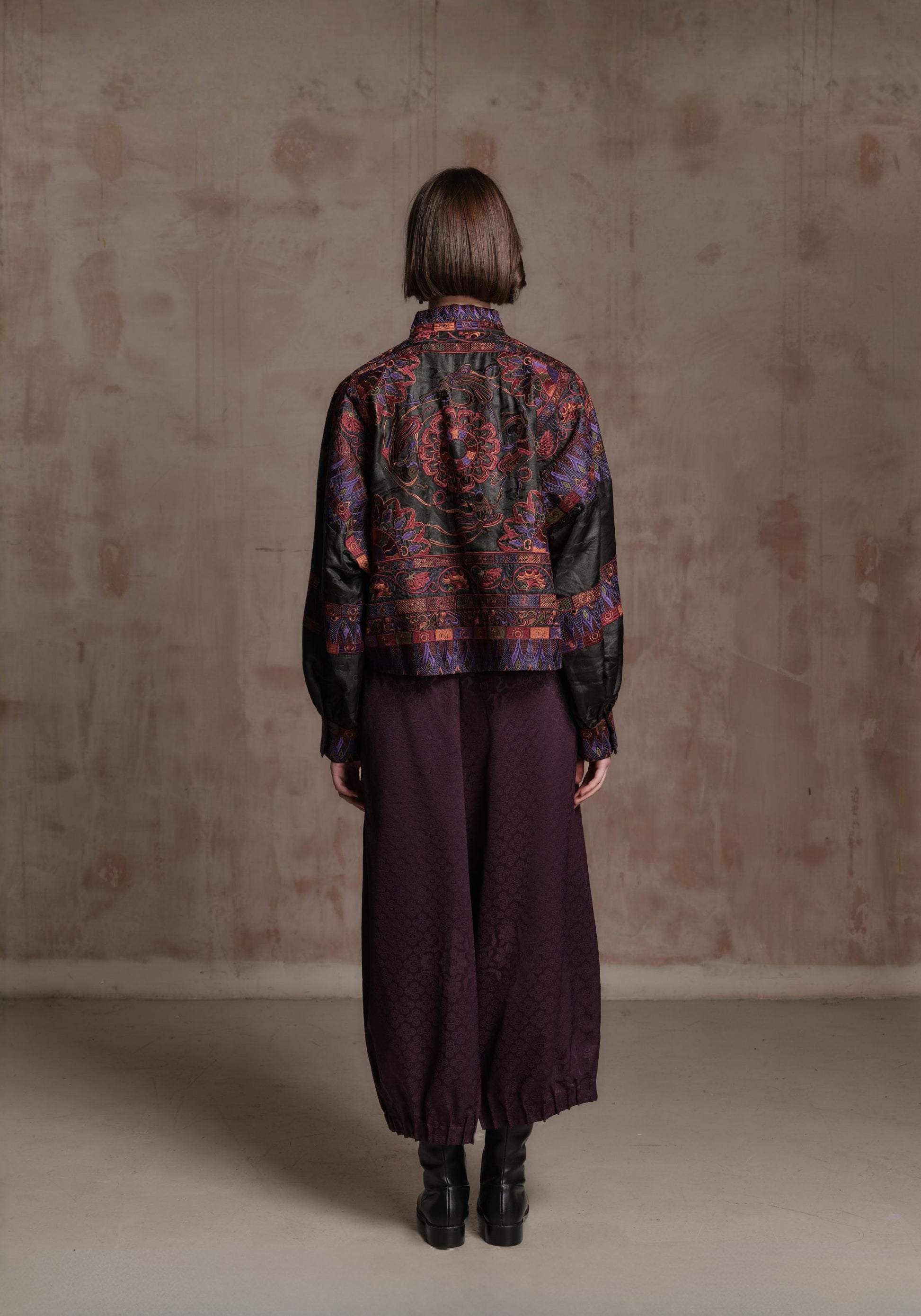 A striking jacket crafted from 100% mud-dyed silk, highlighted with multicolor jacquard patterns and traditional Chinese style knot closures. Fully lined for added comfort, it blends rich artistic detailing with a luxurious texture for a bold, expressive look.