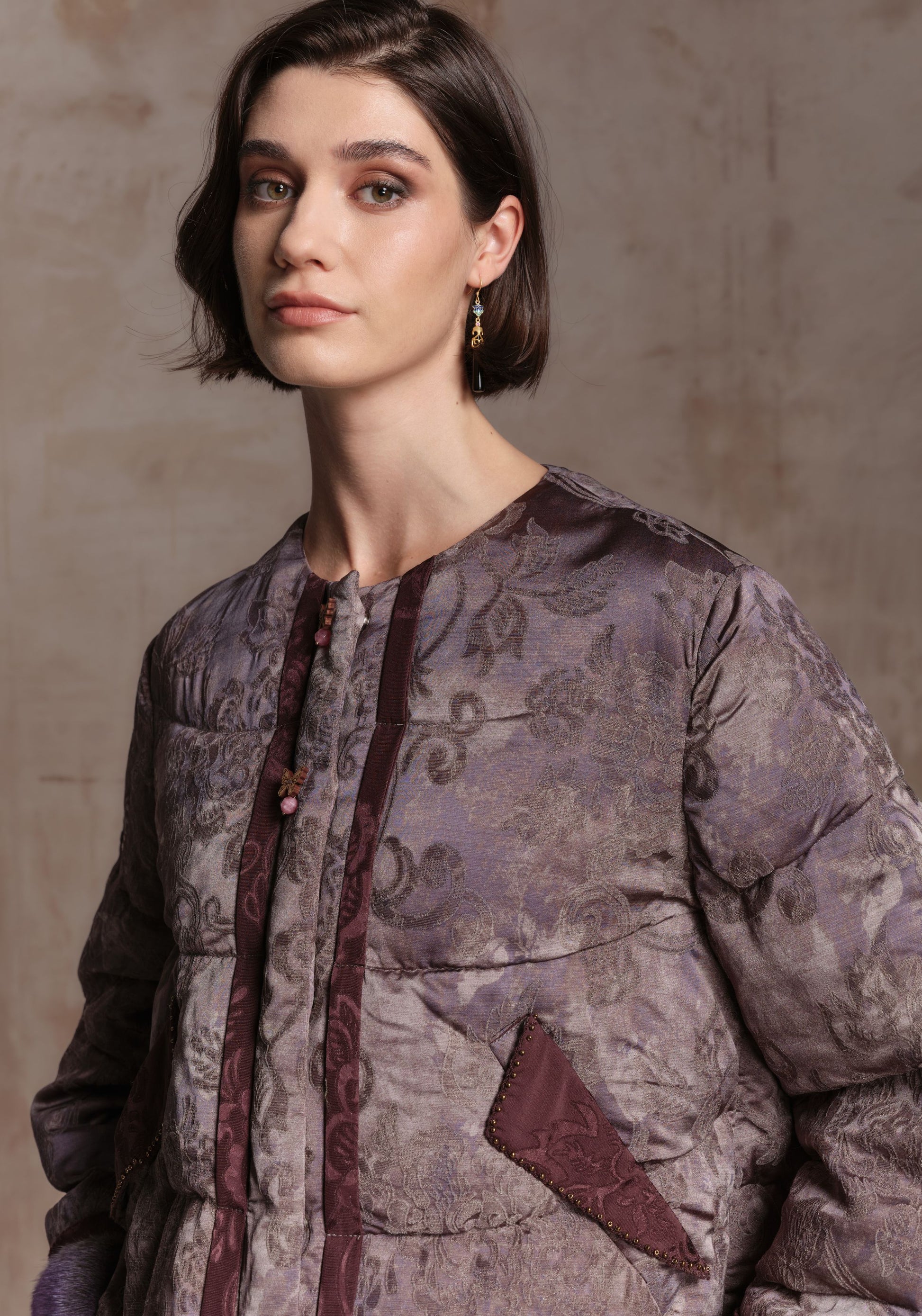 A jacquard wool–viscose blend jacket accented with mink fur cuffs and butterfly style buttons. Filled with goose down, it offers exceptional warmth with a refined, elegant look.