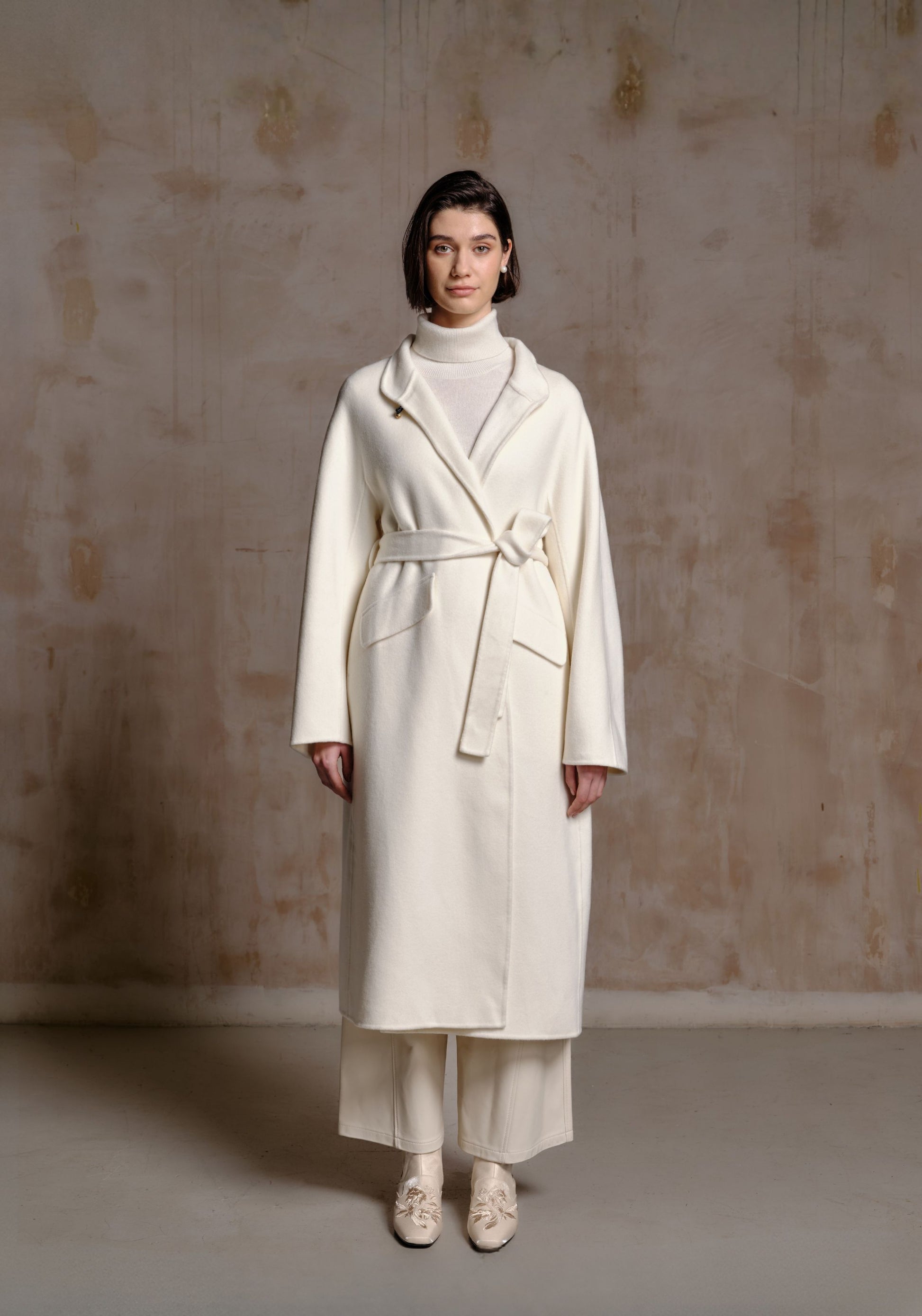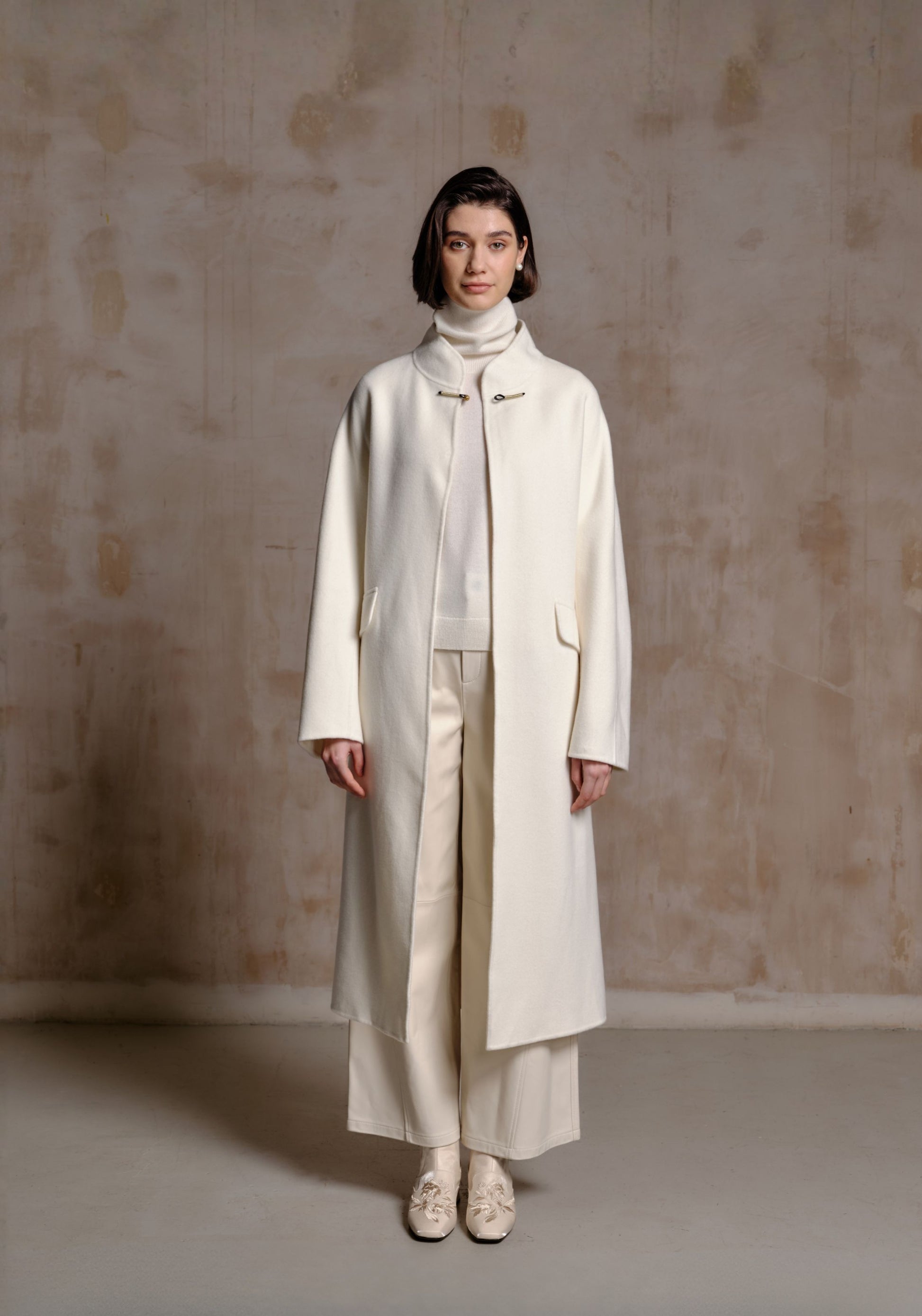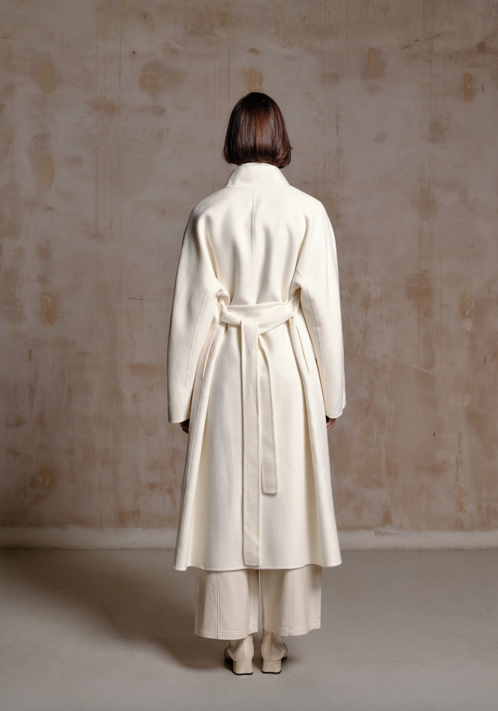 Elegant white wool cashmere coat featuring a belted waist and minimalist Chinese button detail, offering a timeless silhouette that combines sophistication with effortless comfort.