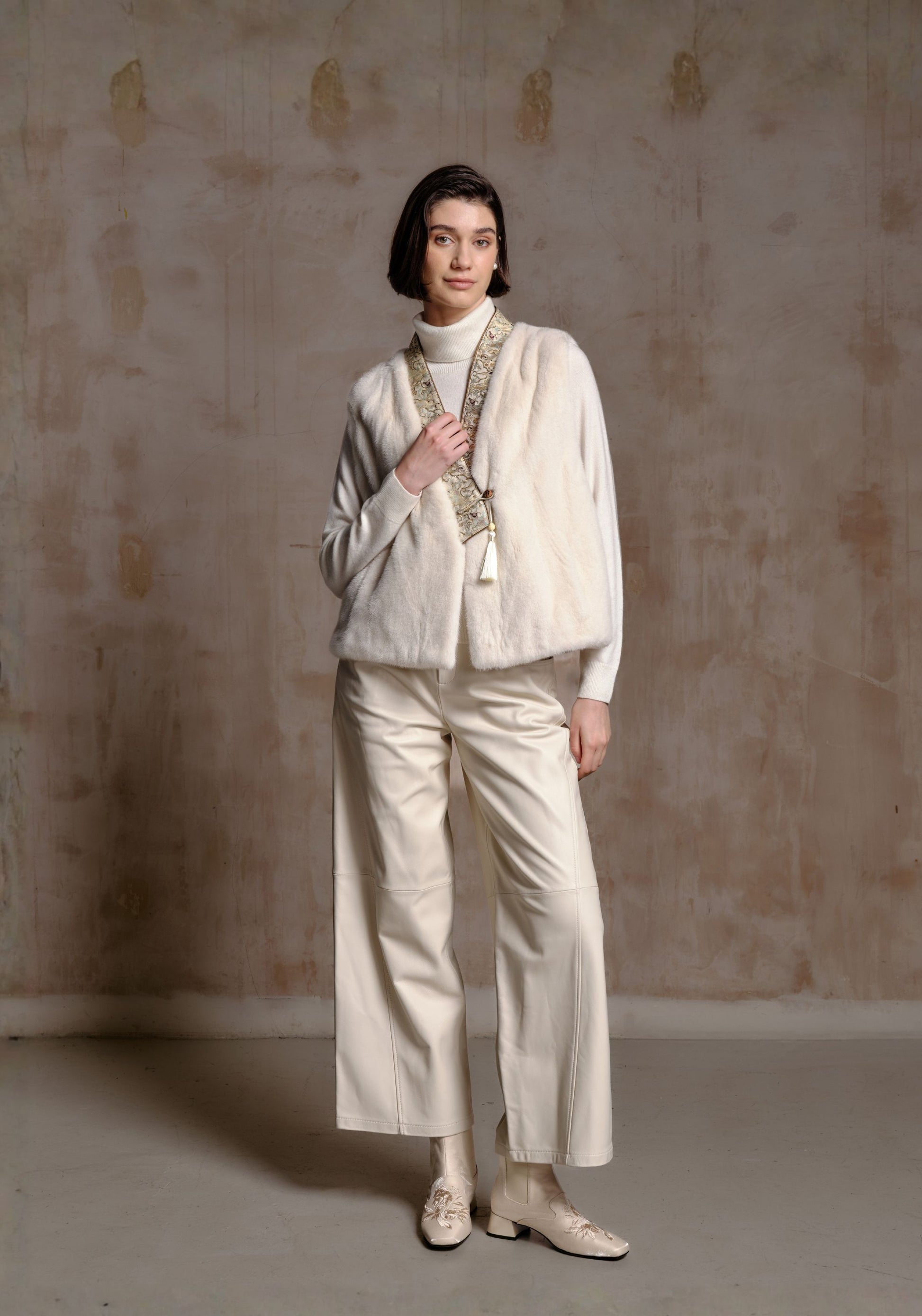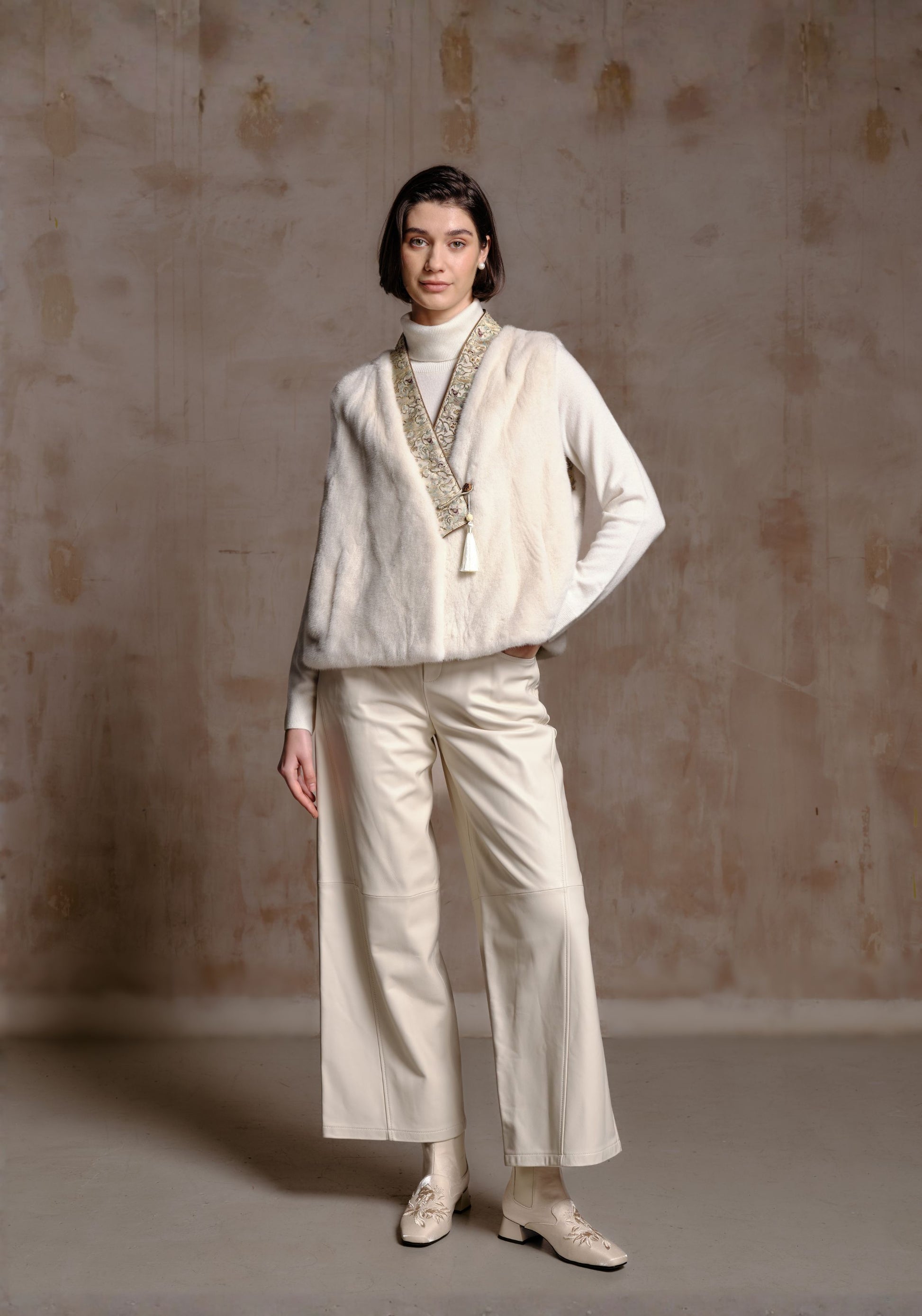 A soft mink fur vest featuring a traditional patterned front panel and a delicate tassel closure. This elegant piece blends luxurious texture with timeless, refined detailing.