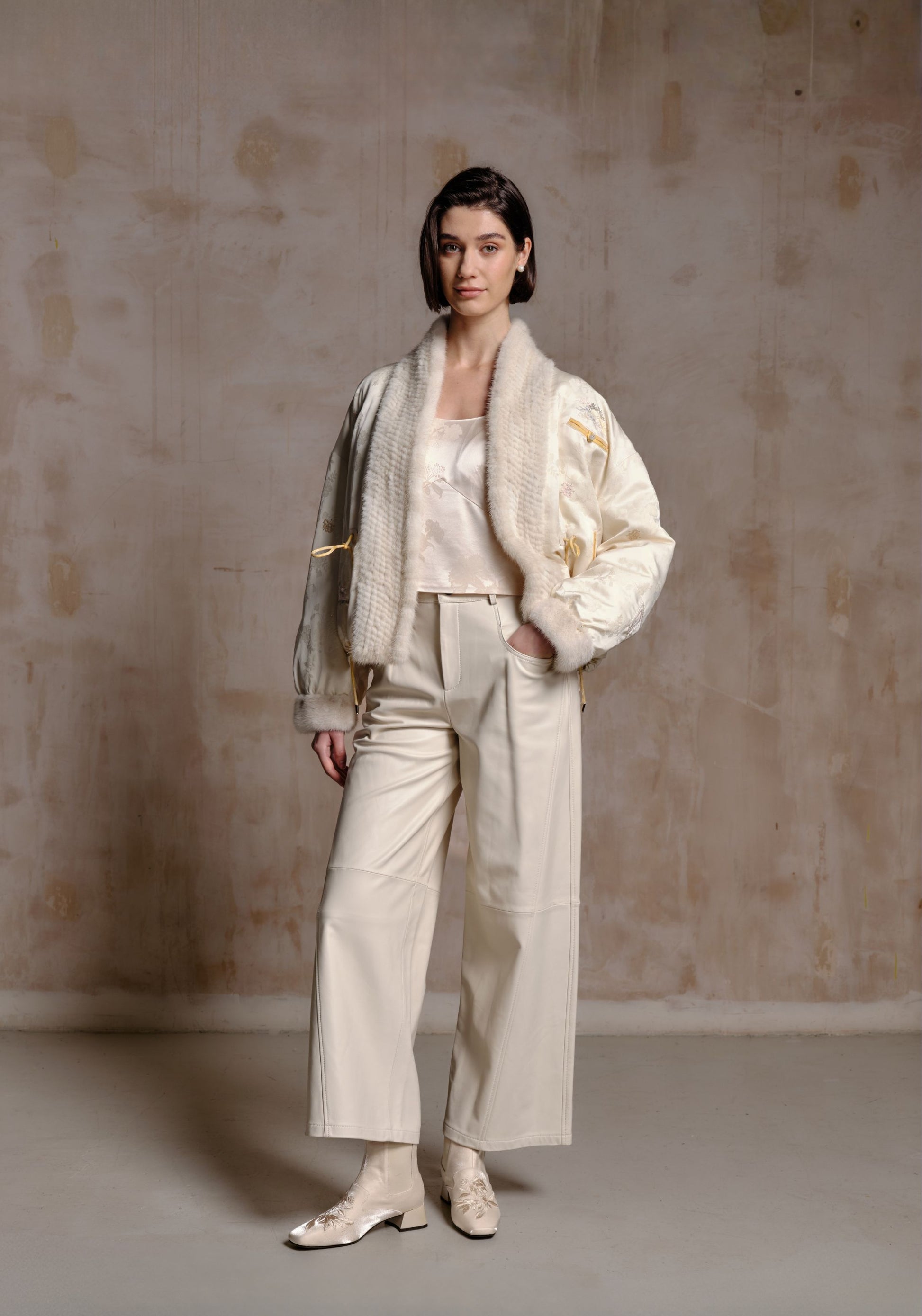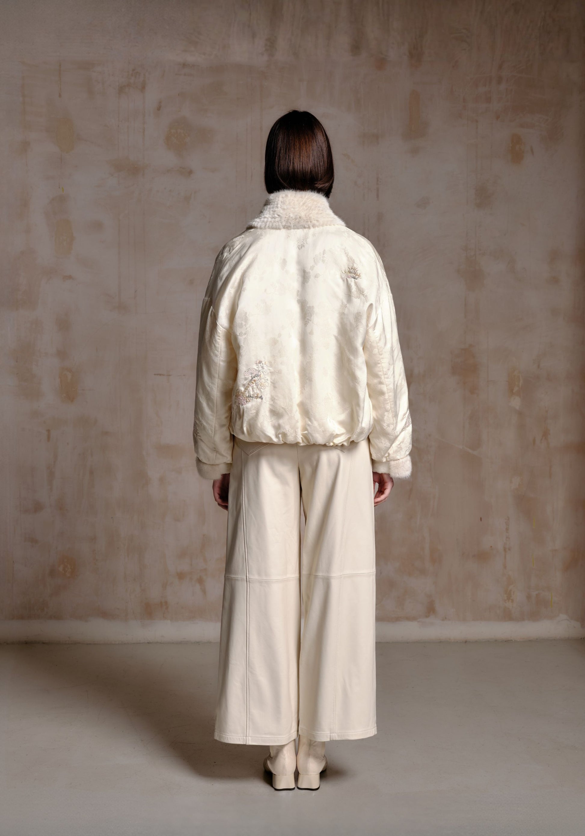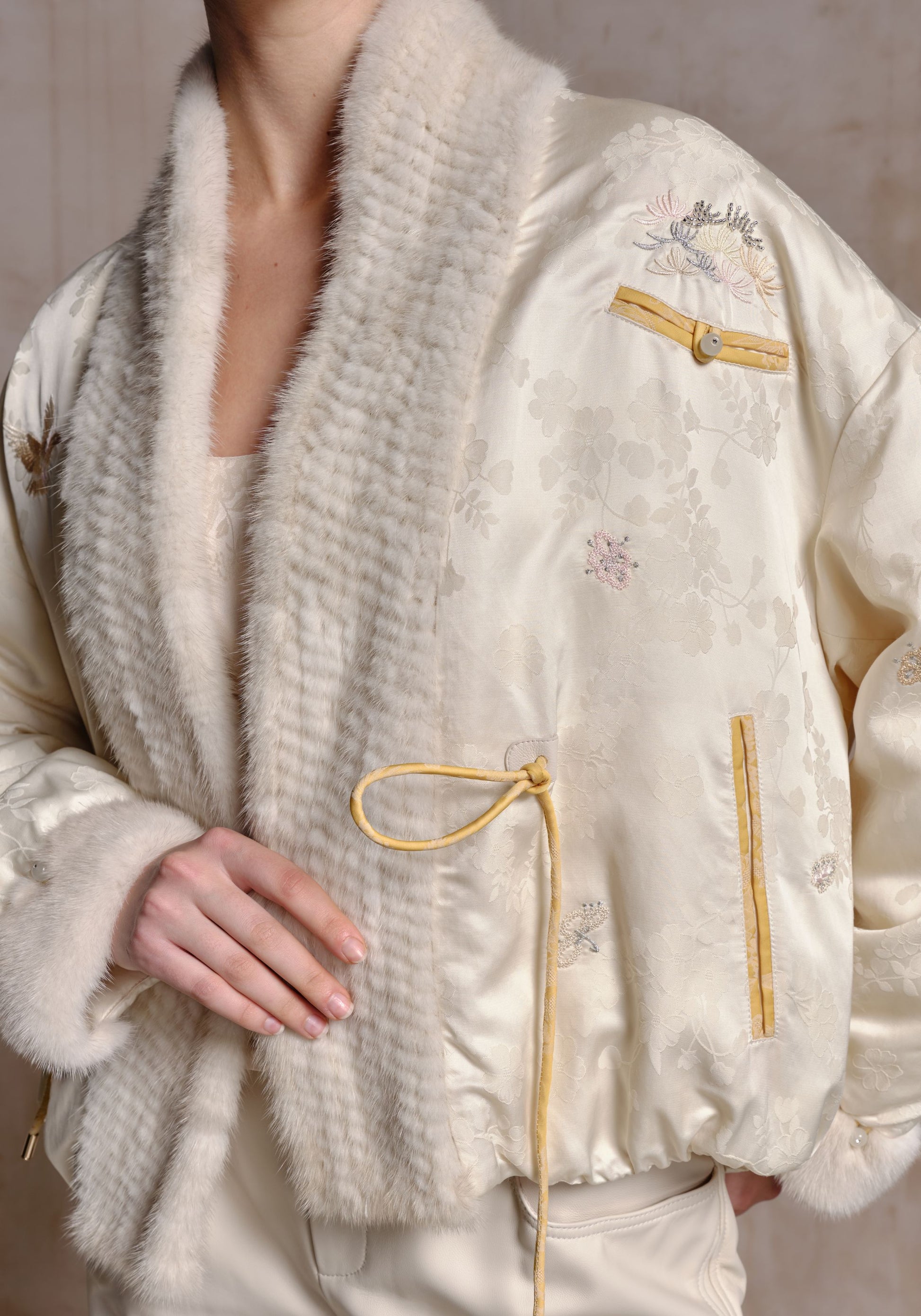 A soft ivory puffer jacket featuring a plush mink fur shawl collar and matching fur trimmed cuffs. Detailed with subtle floral jacquard patterns and delicate embroidered accents, it blends traditional elegance with winter warmth. Filled with premium white goose down for lightweight insulation.